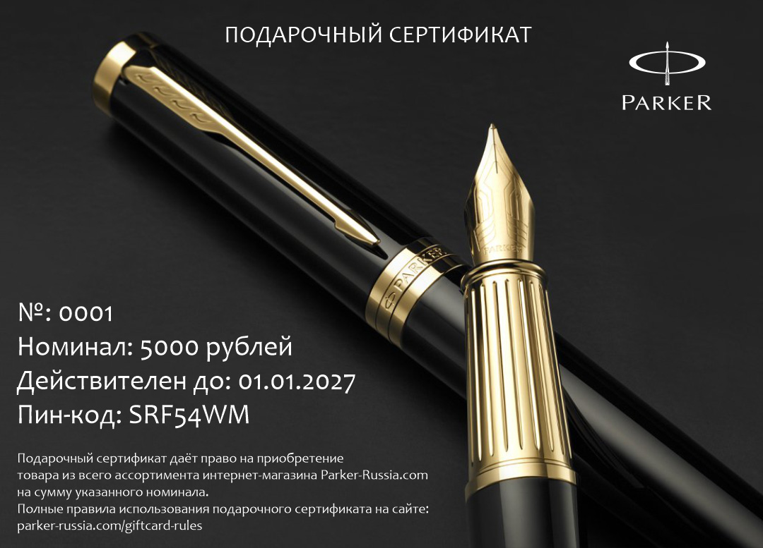 Подарочный сертификат Parker 5000 от официального дилера Parker в Братске. Вы можете дополнительно заказать гравировку, которая подчеркнет Вашу оригинальность и придаст памятность статусному подарку. Все ручки Паркер поставляются в фирменном футляре.